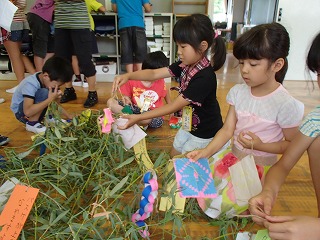 七夕の短冊に願いをこめ、縦割り12班が協力し合って飾り付けをしました。